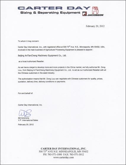 Carter Day公司充分授權北京安田成機械設備有限公司的劉東先生,在中國種業作為Carter Day公司的授權經銷商。作為中國種業的授權經銷商,我們有一個共同的目標就是開發更多的項目在中國市場,對于CarterDay公司旗下所有產品,劉東先生代表Carter Day公司可以與中國客戶有權進行質量交涉、價格、報價、交付時間、交付或付款等等事項。