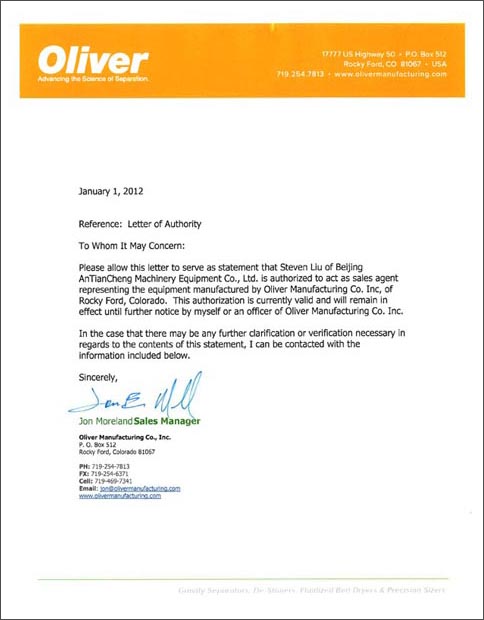 此授權書特此聲明來自北京安田成機械設備有限公司的劉東先生被我公司授權作為一級銷售代理商,代理銷售Oliver制造有限公司旗下所有產品,此授權書自發布之日起,將一直有效,直到Oliver制造有限公司發出新的聲明。